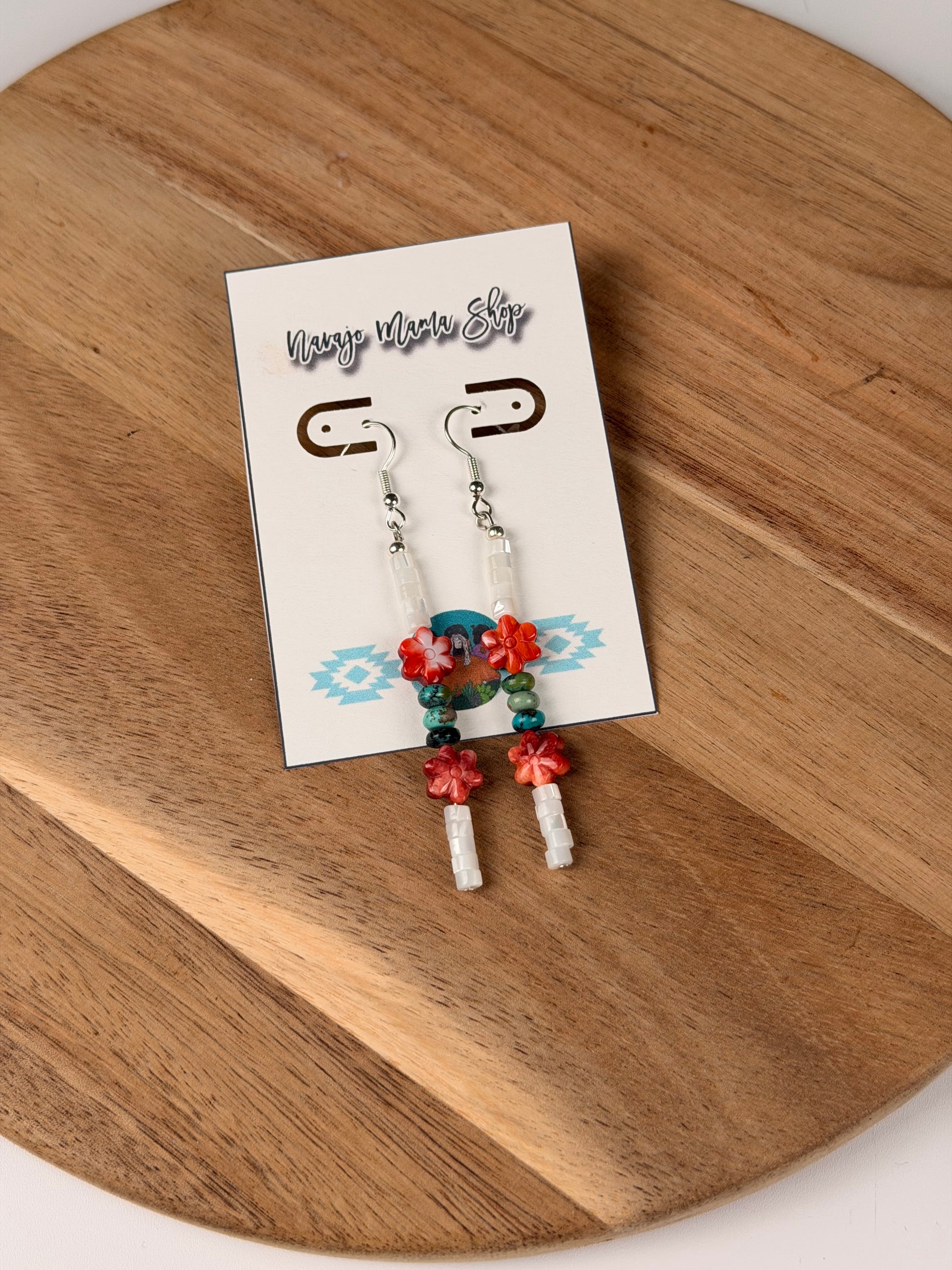 Made of white mother of pearl, red spiny oyster & hubei turquoise on silver plated findings