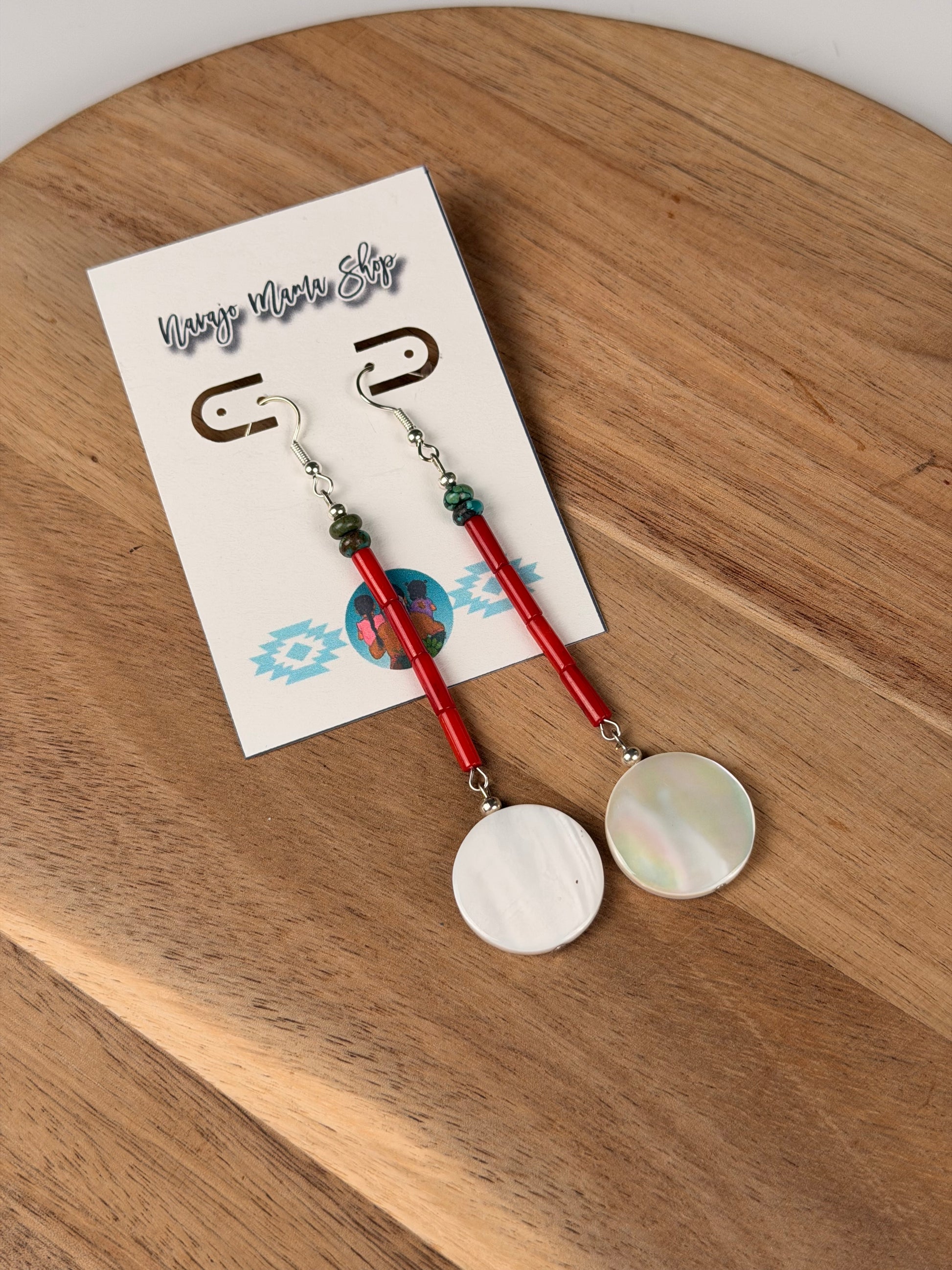 Made of red coral, hubei turquoise and MOP on silver plated findings