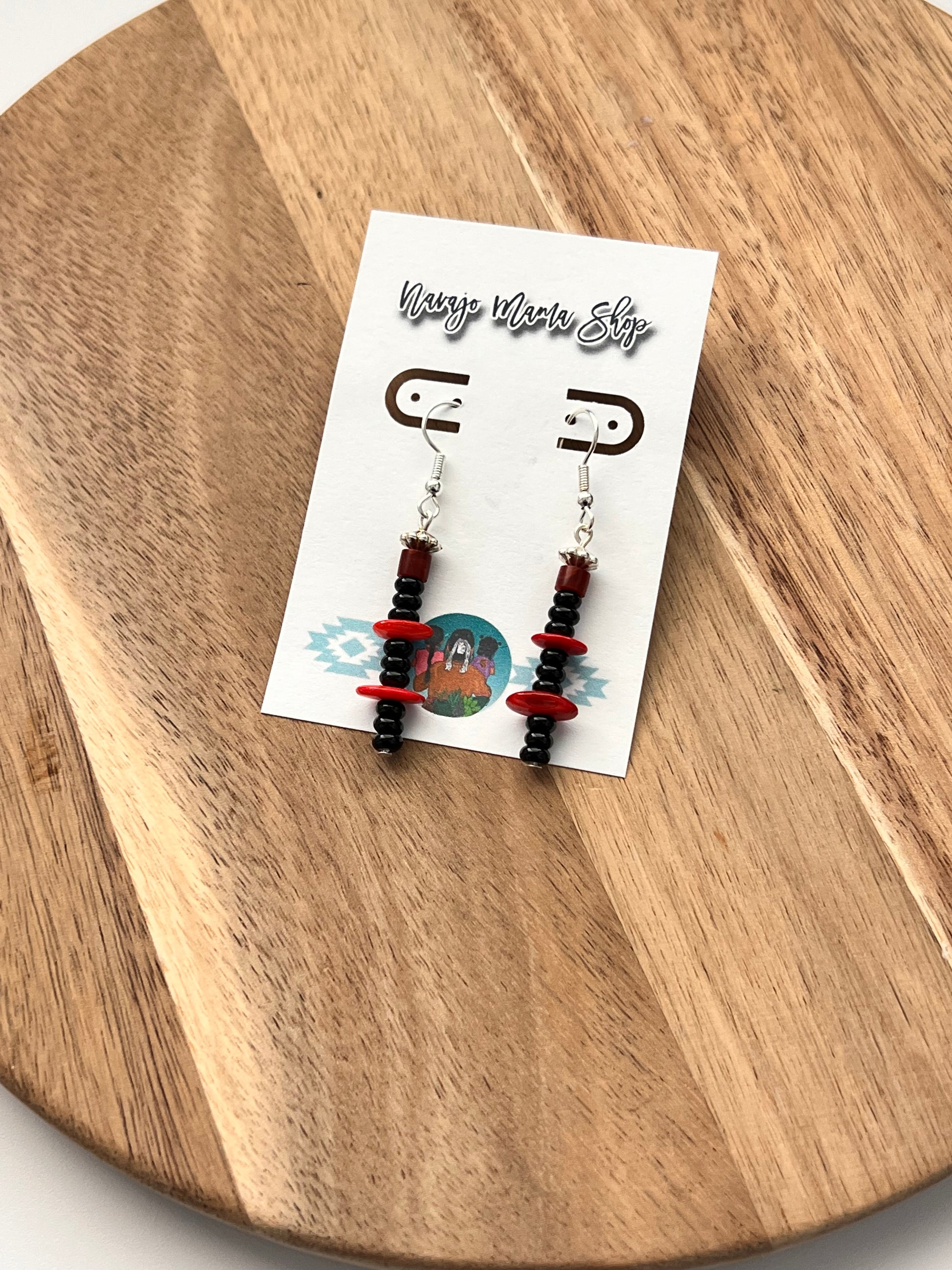 Made of black oynx, dyed red mother of pearl and synthetic heishi on silver plated findings