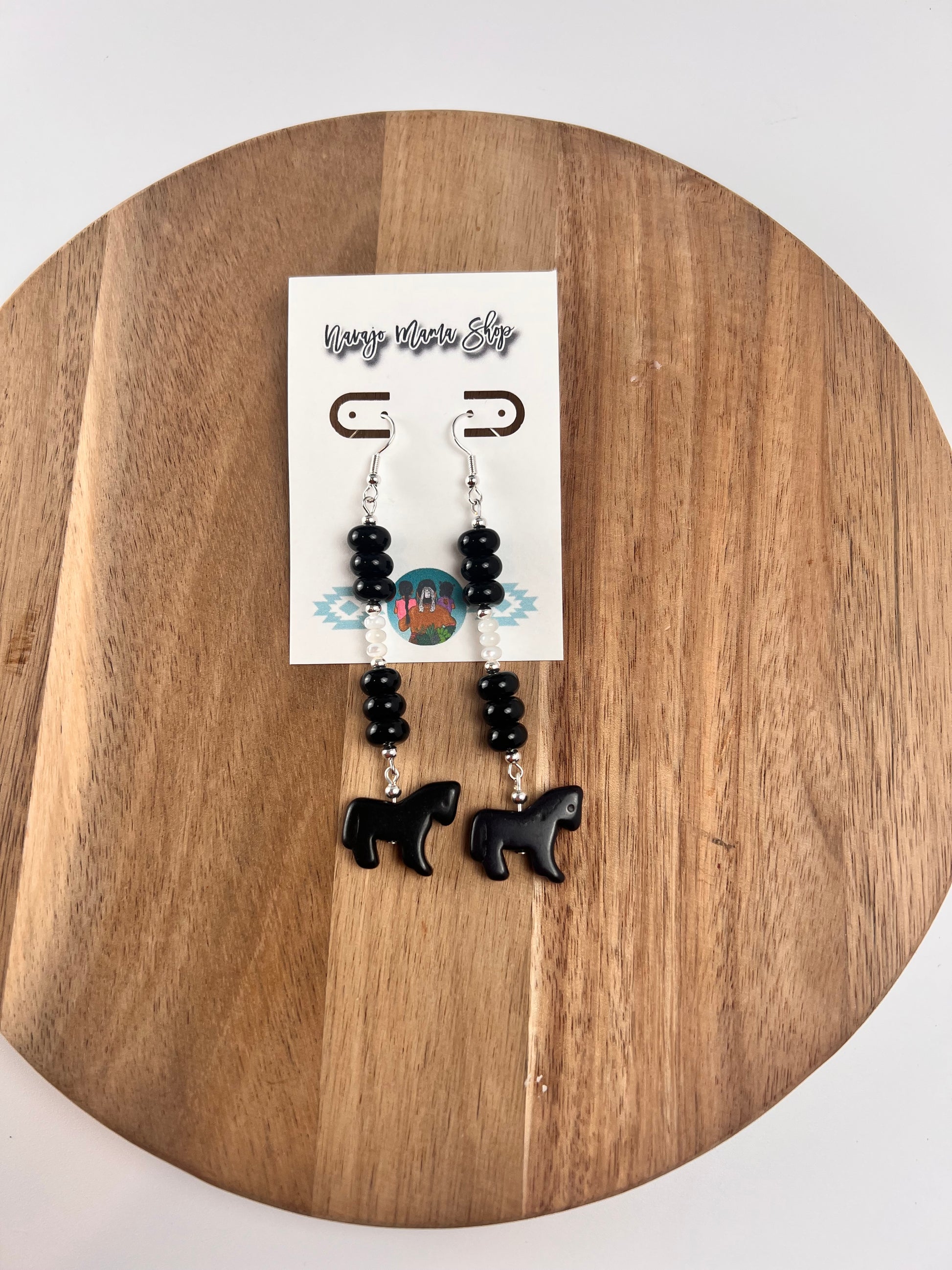 Made of black onyx, black magnesite and white mother of pearl on silver plated findings